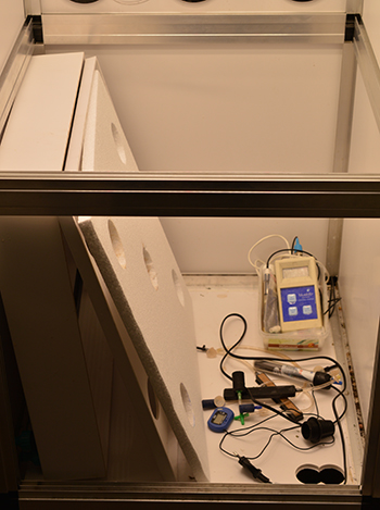 Nou, een heleboel mooie witte wortels dus; ze vormden een perfect vierkant matrasje in het wortelreservoir! De wortels hadden de bruissteentjes helemaal ingepakt, ik moest ze gaan zoeken door de luchtslangen te volgen want te zien waren ze niet meer.