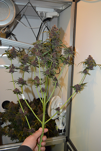 Op de foto’s lijken de toppen hierdoor paars maar in werkelijkheid zijn ze veel intenser en donkerder van kleur. Tijdens het oogsten en in het natuurlijke licht kon ik de ware kleuren goed zien, en de toppen zijn bijna diep rood. Op de website van Sensi Seeds staat dat de meeste planten van deze soort olijfgroene toppen hebben maar dat sommige bladeren paars kunnen worden, en dat die kleur soms zelfs in de toppen te zien is.