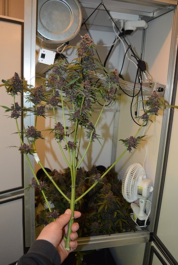 Lang verhaal kort; ik heb de grootste takken één voor één afgeknipt en de plant dus in delen geoogst. Zo hangt het ook niet zo dicht op elkaar in mijn droogtent, en kon ik de schutbladeren ook wat makkelijker verwijderen. Die waren bij de Purple Berry Muffinz trouwens heel makkelijk eraf te plukken. Bij sommige wietsoorten trek je met ieder blad een heel touw aan bast mee maar bij deze dame dus niet.