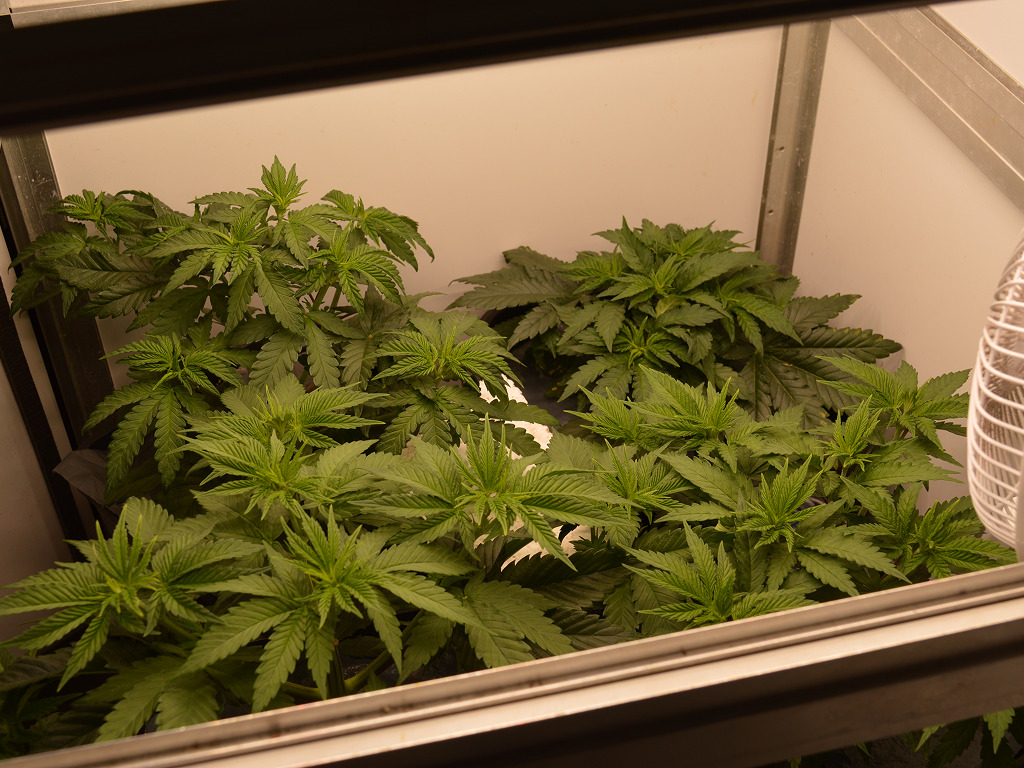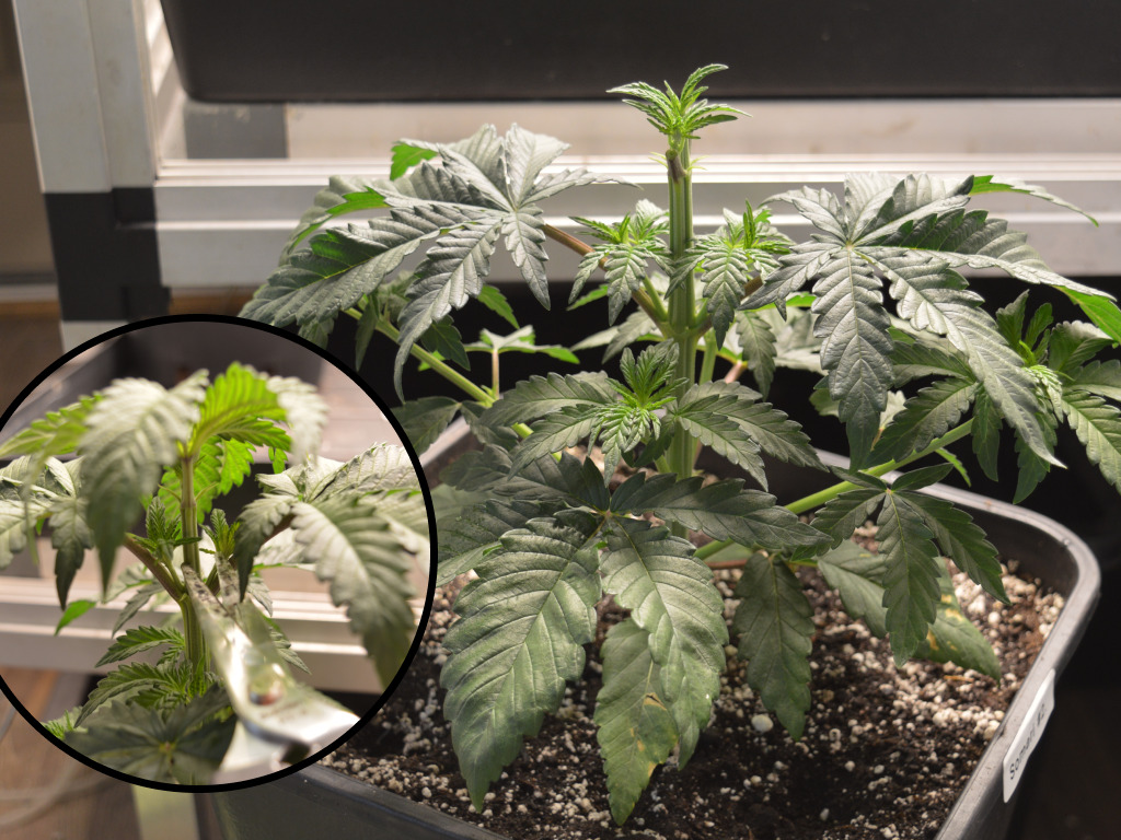 Na het verpotten komen wietplanten altijd in een stroomversnelling door de extra ruimte. Op 27 maart waren de Somari’s daardoor al behoorlijk gegroeid. De spruiten van de zijtakken zaten nog een beetje onder de schutbladeren verstopt, dus heb ik ook de bovenste twee schutbladeren van elke plant verwijderd.