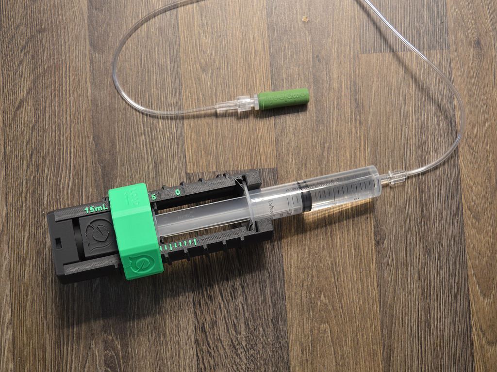 En dan ben ik eindelijk bij het spannende deel van dit verhaal, namelijk het aansluiten van het Ampleafy infuus. Het apparaat is eigenlijk een houder, die de bijgeleverde spuit met suikerwater met een veer onder druk houdt. Een heel lage druk van maar 0,5 bar om precies te zijn, want dat leverde het beste resultaat in het Sloveense onderzoek waar dit apparaat op gebaseerd is.