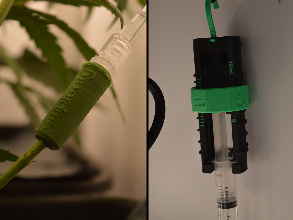 Om het apparaat aan te sluiten zet je de spuit in de houder met de veer, en sluit je de infuusslang aan op een speciale mof die bij het apparaat komt. Deze siliconen mof schuif je vervolgens over een schuin afgesneden zijtak, zodat het suikerwater direct in het merg van de plant komt.