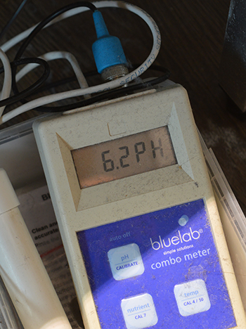 Hydrokweken is zo eenvoudig (en efficiënt) dat ik de afgelopen week niets heb gedaan. De pH- waarde was aan het einde van mijn verslag van vorige week 5,8 en de EC-waarde had ik afgesteld op 1,6. Toen ik vandaag ging meten bleek de pH-waarde gestegen naar 6,2 en de EC-waarde was eveneens gestegen naar een waarde van 1,8. Dit betekent dat de plant deze week meer water heeft opgenomen dan voeding (immers, de EC-waarde steeg, en er is water verdampt). Het betekent dus ook dat de behoefte aan voeding wat lager is dan de hoeveelheid voeding in het water.
