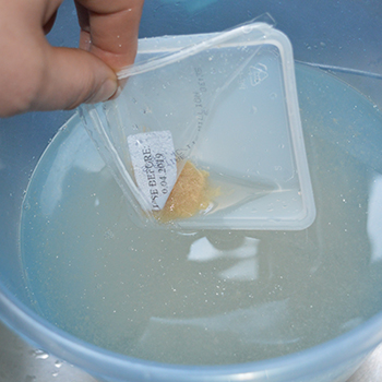 Ik heb ongeveer drie liter water aangemaakt waaraan ik de aaltjes en de Bactrex heb toegevoegd. Dit heb ik met wat natuurazijn op een pH-waarde van 6,3 gebracht en over de planten verdeeld (ongeveer 300 milliliter per plant). Je moet het water goed blijven roeren want met name de aaltjes lossen niet echt op, hoewel minuscuul klein blijven het natuurlijk wel gewoon beestjes.