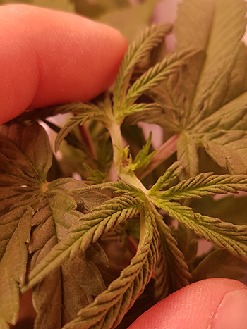 Om de kleine wietplantjes zo min mogelijk te storen in hun groei, haal ik bij het toppen slechts het uiterste groeipuntje weg. Hiervoor vouw ik eerst de bovenste blaadjes opzij, zodat ik het topje tussen mijn duim en wijsvinger kan wegplukken. Met het volgende als resultaat.