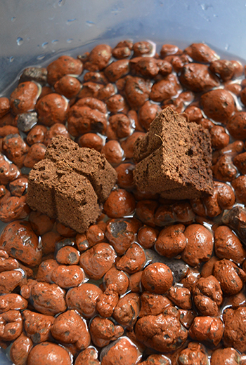 Omdat ik de zaailingen vanaf het begin wat voeding wil geven laat ik de pluggen en de kleikorrels in een lichte voedingsoplossing weken. Op de verpakking van Druid stond te lezen dat 1 gram per liter voor een EC-waarde van 1,2 zou zorgen. Omdat dat echter nog een beetje te veel van het goed is voor zaailingen, heb ik 1,3 gram afgewogen voor twee liter water.