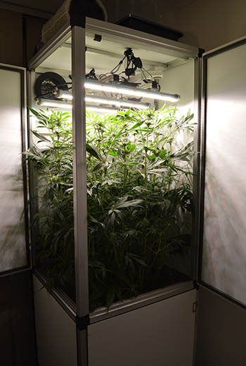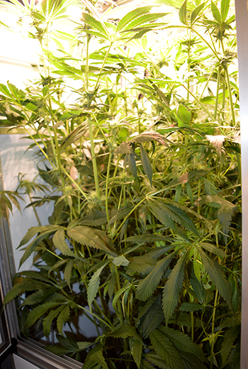 De bruine plekken die je hier en daar op de bladeren ziet, zijn veroorzaakt door de lamp toen die nog iets lager hing en hebben dus niets met de gezondheid van de plant te maken. Wat lager in de kast groeien inmiddels wel heel veel topjes en takken die ik eigenlijk weg zou moeten halen omdat ze te weinig licht krijgen. Ik durf dit echter nog niet te doen, omdat ik vrees dat de plant dan nog meer zou kunnen strekken. Het moet echter wel gebeuren maar ik wacht er nog even mee voor de zekerheid. Op de volgende foto’s zie je wel wat een jungle het onder in de kast geworden is.