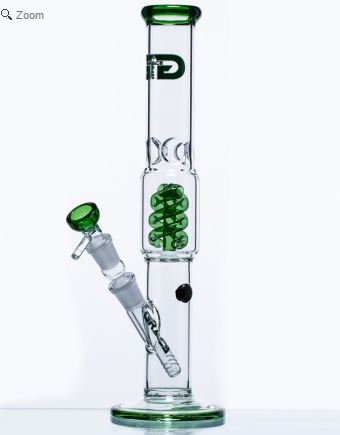 37 centimeter hoge Bong van GGBongs met percolator en mooie groene glazen elementen. Gemaakt van gehard en hittebestendig borosilicaatglas van 5 millimeter dik. Zonder ijs inkepingen, maar met glas op glas verbindingen, deze bong en losse bowls zijn ook verkrijgbaar in verschillende andere kleuren. - Amber Beaker GG Bong (G340U), 75 euro