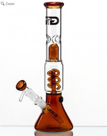 35 centimeter hoge bong met percolator, van gehard borosilicaatglas en mét ijs inkepingen. Mooie amberkleurige elementen en geïnspireerd op laboratoriumglaswerk. Deze bong en losse bowls zijn tevens verkrijgbaar in verschillende andere kleuren.