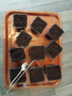 Om de zaden in de grond over te plaatsen, vulde ik eerst 10 kleine potjes met aarde. Met een satéprikker prik ik vervolgens gaatjes in de aarde voor het worteltje. Vervolgens neem ik een theelepel waarmee ik de zaden voorzichtig een voor een oppak.