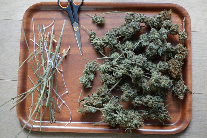 Het knippen zelf was niet al teveel werk omdat de toppen van de Gorilla Glue kneiterhard zijn. De grote schutbladeren had ik bij de oogst al verwijderd dus die zaten er niet meer aan. Op een dienblad heb ik eerst de toppen verzameld. Aan iedere top liet ik expres een stukje steel over om de top handig aan te kunnen vasthouden.