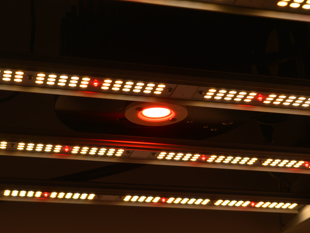 Wat ik wel zal proberen, is om het rode licht de eerste en de laatste halve uurtjes van de dag aan te zetten. Dit zou de overgang van nacht naar dag en dag naar nacht verbeteren. Versnellen vooral, zodat de planten ’s ochtends sneller aan de fotosynthese beginnen, en ’s avonds sneller in slaapstand gaan. Dat moet ik alleen wel goed uitkienen want de twee lampen draaien op verschillende schakelklokken…