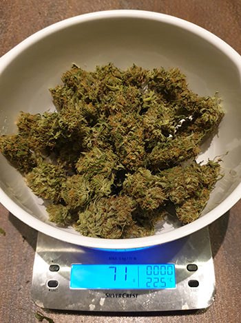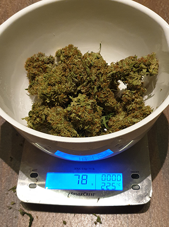 Na een week of twee waren de toppen droog en kon ik de wiet gaan wegen, om de eindscore te bepalen. De foto links is van de vierde laag (83 gram), en op de foto rechts zie je de 71 gram van de derde laag. Daaronder links 78 gram van de tweede laag, en op de foto rechts de grote toppen van de eerste laag (119 gram!). Op de bodem lag nog eens 62 gram.
