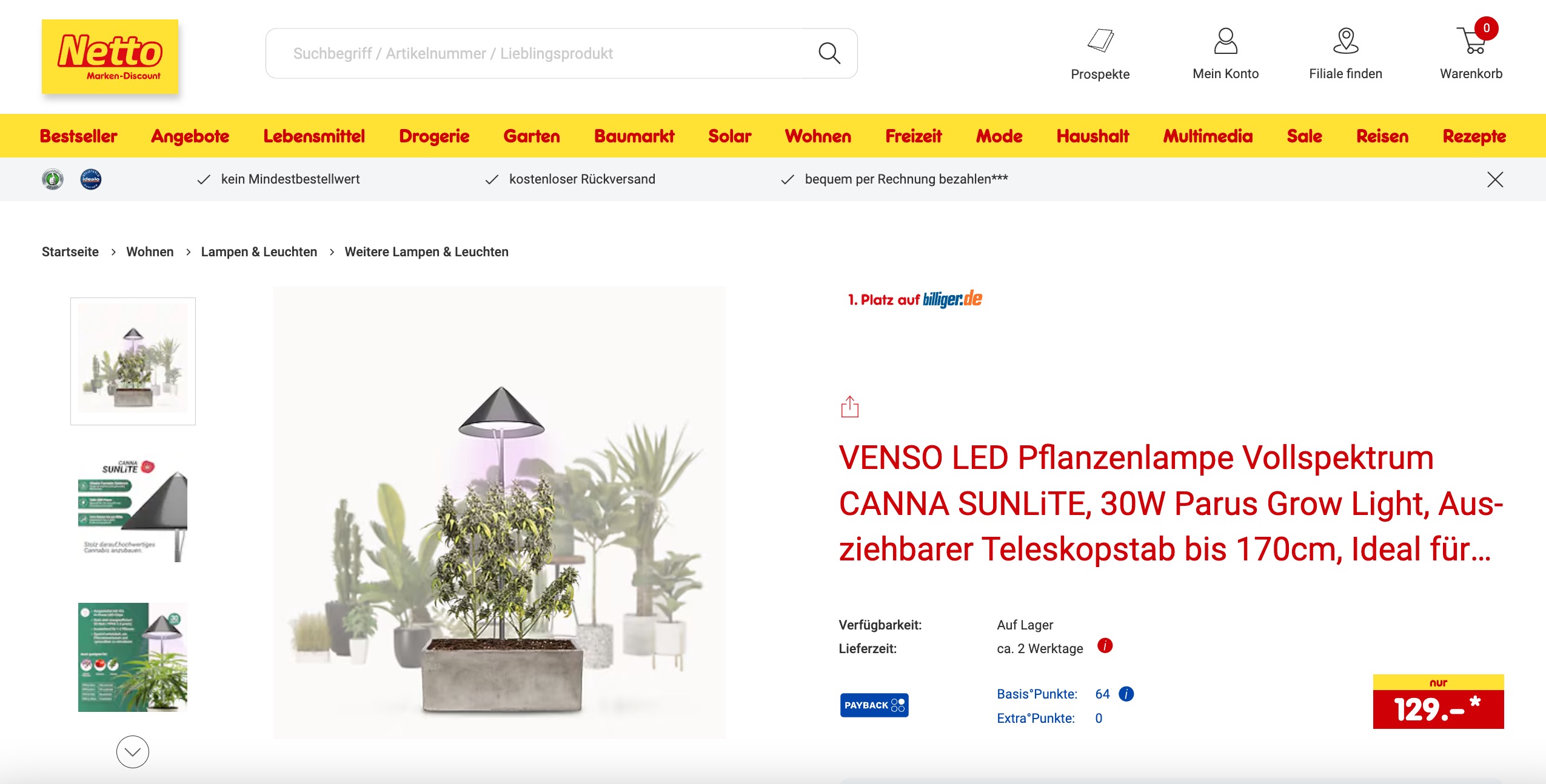 Netto denkt zelfs nog verder met de thuiskweker mee dan alleen het aanbieden van de cannabiszaden in de fysieke winkelfilialen. Online biedt de supermarkt namelijk voor een zacht prijsje een LED kweeklamp aan!