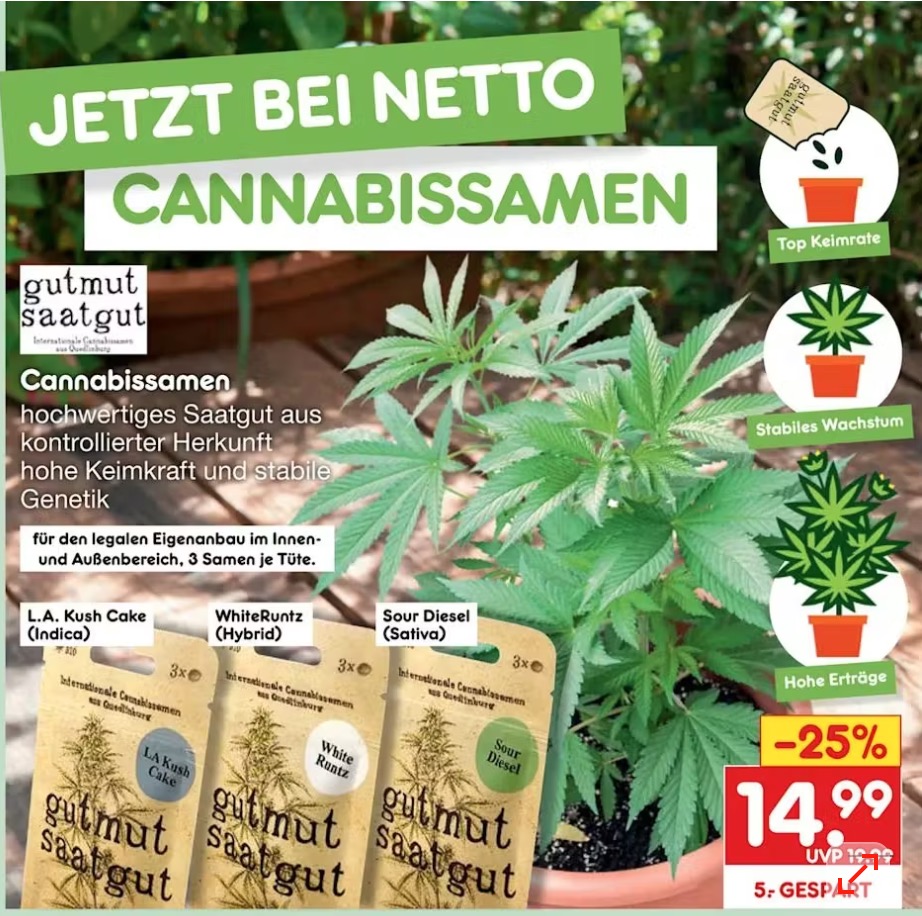 Het was natuurlijk wachten op de eerste ‘normale’ winkel die zo snugger is om gebruik te maken van het feit dat cannabis in Duitsland uit het strafrecht is gehaald. Immers, elke volwassen inwoner bij de buren mag ongestraft 3 wietplanten voor eigen, niet-commercieel gebruik kweken. Enter supermarkt Netto!
