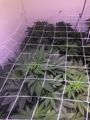 Inmiddels heb ik alle grote planten bij elkaar gezet, en een scrognet geïnstalleerd achter in de kweekruimte. Dit zijn de Skunk XL en de Flower Power van Royal Queen Seeds. Het zijn prachtige volle planten geworden, ze zijn allemaal één keer gefimd en ik ben erg blij met het resultaat. Het scrognet heb ik geïnstalleerd omdat deze planten anders nog wel eens te hoog kunnen gaan worden en de lamp kunnen gaan raken. Fimmen zorgt er lang niet altijd voor dat je plant kort blijft.