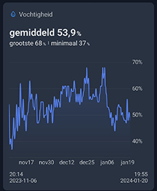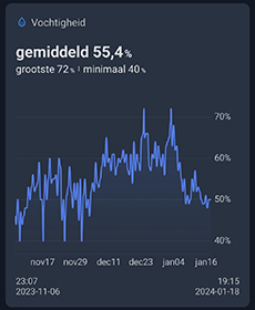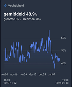 En dus heb ik de klimaatgegevens erbij gepakt. Die zien er goed uit, afgezien van twee uitschieters in de luchtvochtigheid die even boven de 65% kwam. De Sneeze maakt hele dikke toppen en die houden niet zo van een vochtige ruimte. Om de luchtvochtigheid binnen de marges te houden heb ik de kamer waarin de kast staat, extra goed geventileerd op dagen dat het niet regende. Helaas heeft het de afgelopen maanden alleen heel veel geregend.