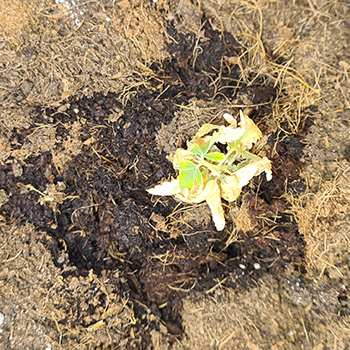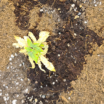 Nu ik de eerste vijf Mohammeds heb besproken, is er zoals de vaste lezer wel weet nog één over. Dit was het plantje met het meeste groene blad. Het verpotten van deze Mohammed is een nieuwe ervaring, omdat ik deze op kokos ga kweken met voedingstabletten in een Autopot.