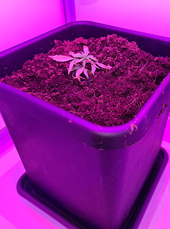 Het verpotten van dít plantje verliep gelukkig goed. Het is alleen wel erg spannend om te starten met zo’n drijfnatte ondergrond. Ik heb de pot nog niet op de autopot-bodembak gezet, want ik wil de kokos eerst wat laten drogen. De kast zal in verband met de accu en de zonnepanelen ook naar een andere ruimte moeten verhuizen. Dan zal ik meteen de autopot met waterreservoir plaatsen.