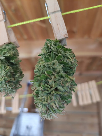 Aan het einde van bloeiweek 6 besloot ik toch maar om de toen nog intacte hoofdtoppen te oogsten. De microscoop werd erbij gehaald en de trichomen van de hoofdtoppen waren al melkachtig. De hoofdtoppen werden geknipt en te drogen gehangen in mijn tuinhuisje.