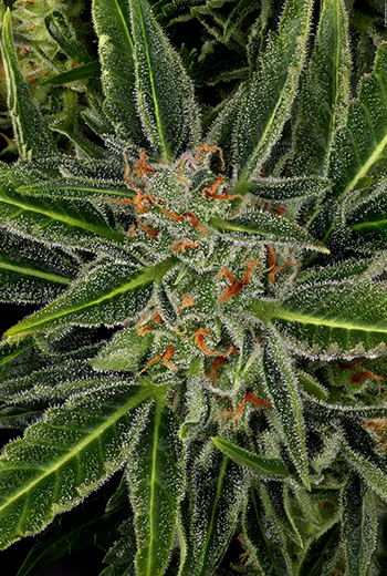 Op dag 37 zaten de toppen al vol met glinsterende en plakkerige harsklieren, en ondanks de behoorlijk snelle strek had de plant nog steeds een volle en bossige structuur. Ze groeide echter zo goed dat de LED lampen op een gegeven moment wel iets té dichtbij kwamen. Om dat op te lossen heb ik de hoofdstam toen met behulp van een stok, onder een hoek van ongeveer 45 graden omlaag gebogen.