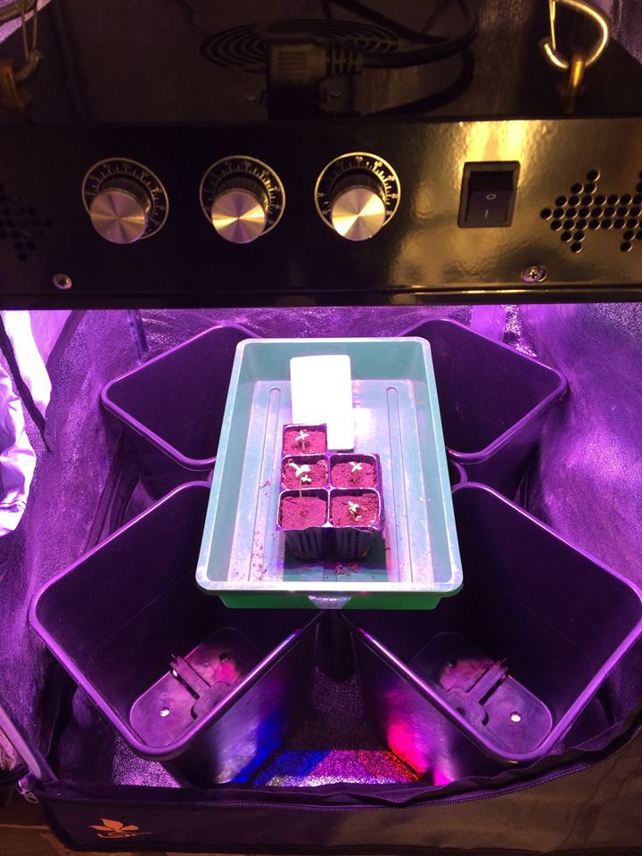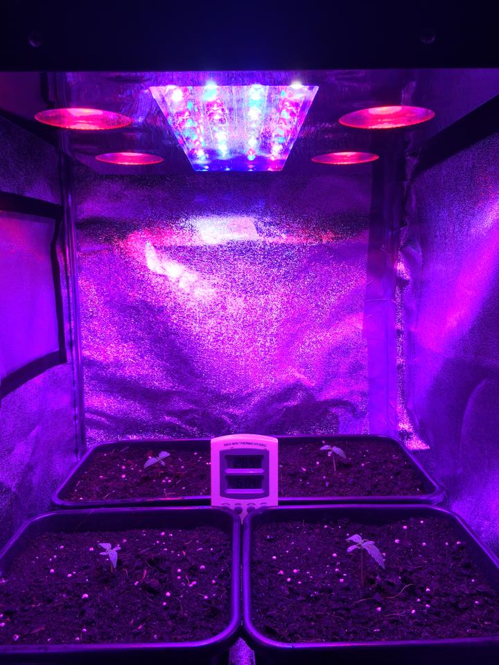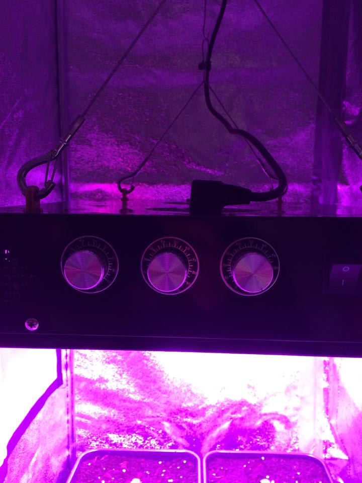 Voordat de kiemende zaden blaadjes hebben zet ik alleen het witte licht aan op 50% van de capaciteit, als de blaadjes zichtbaar zijn zet ik het witte licht vol aan. Na een dag of drie kun je dan wat blauw en een klein beetje rood licht bijvoegen (10% Rood en 30% blauw). Wanneer de kiempjes dan echte plantjes geworden zijn kun je de lamp gewoon op vol vermogen aanzetten. Ik kreeg wel de tip om aan het begin van de bloei het rode licht tot 50% te dimmen om strek te voorkomen, maar aangezien ik autoflowers onder de LED ga kweken hoeft dat bij mij niet. Maar zover zijn we nog lang niet.