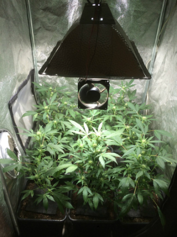Hoewel ik maar klein kweek, met slechts 150 Watt aan licht, probeer ik dat wel zo efficiënt mogelijk te doen. De negen plantjes en de stekken zijn daar een voorbeeld van, maar ook de lampen die ik gebruik. Voor de groeifase heb ik een metaal halide lamp gebruikt. Deze geeft een koeler gekleurd licht dat beter is voor groeiende planten. De HPS lamp geeft een roder licht en is beter voor de bloeifase. Daarom schijnt de HPS nu ook boven de planten, ze staan immers in bloei. Alleen voor de foto’s verwissel ik een keer per week de HPS lamp om voor de metaal halide. Voordat de lamp ’s ochtends aan gaat verwissel ik hem zodat de planten er geen hinder van ondervinden.