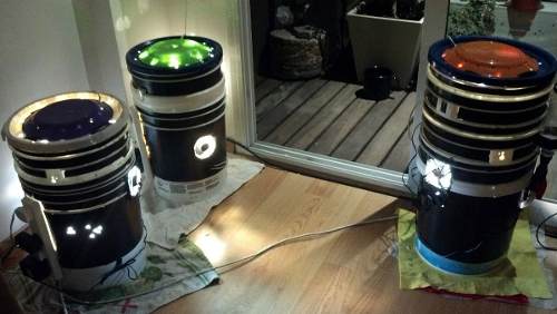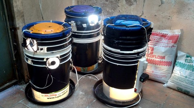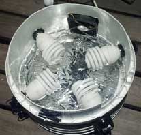 Je hebt de basis van de Space Bucket gemaakt, maar er is nog geen lichtbron. Deze gaan we nu maken. Gebruik hiervoor de bovenkant van een van de andere emmers waar een deksel op zit. bekleed de binnenkant weer met de reflectiefolie en maak in de zijkant vier gaten voor de fittingen zoals op de plaatjes. Sluit de lampen aan op een stekker met behulp van geaarde kabels. De stekker gaat straks op de schakelklok om het lichtregime mee in te kunnen stellen.