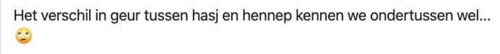 Brrr… alleen die woordkeuze ‘verdovende middelen’ van de agent om wiet en hasj aan te duiden, bezorgt ons koude rillingen en flashbacks van spuitende heroïnejunkies achter het centraal station. Om dit stukje overheidspropaganda tegen cannabis weer eens treffend af te sluiten, knallen we er nog een allerlaatst screenshotje in van de hasj … pardon, hashtags waarmee Oom Agent zijn Facebook-post beëindigt. Fijne dag nog verder, hè!