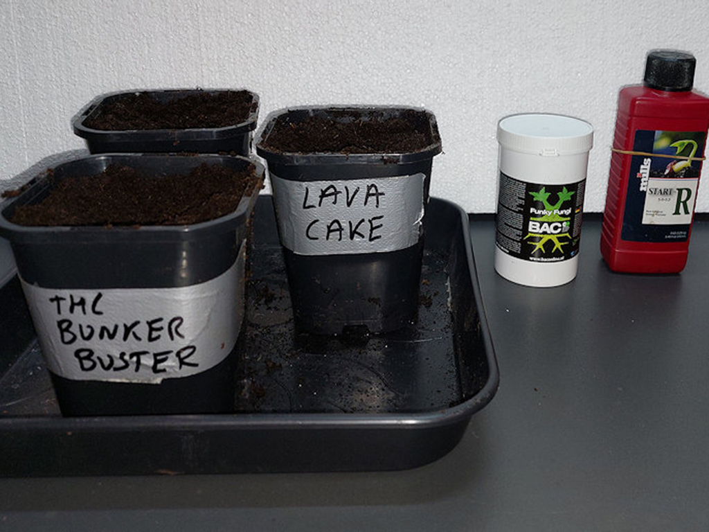 Ik had nog twee THC Bunker Buster zaadjes, en een nieuwe Lava Cake, allemaal van Zamnesia. De bloeitijd hiervan is een 8-tal weken, dus dat zou – inclusief de droogtijd – nog net moeten kunnen voor ons verlof. Ontkiemen heb ik gedaan op de klassieke manier, tussen koffiefilters in een ziplock zakje. Aan het water voeg ik SeedBooster van Plagron toe. Zo heb ik bijna altijd 100% ontkiem succes, en ook deze keer. Na iets meer dan 24 uur waren de drie zaadjes namelijk ontkiemd.