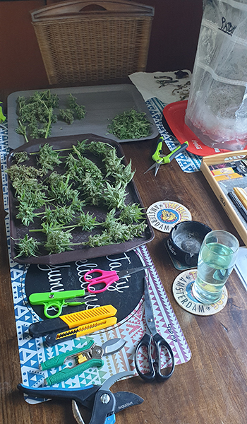 De toppen hangen nu te drogen. Over zo’n 10 tot 14 dagen zal ik het wegen en gaan ze de cure/weckpotten in en zijn ze klaar om gerookt te worden. De knipresten bewaar ik in de vriezer en kan ik later nog hasj of edibles van maken.
