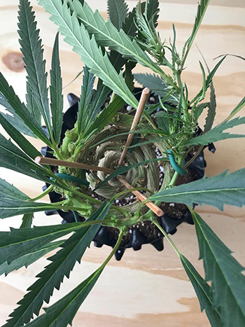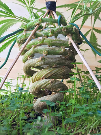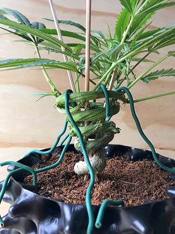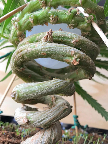 Hierboven zie je de eerste 86 dagen uit het leven van de Cinderella 99 budzai. Met binddraad en satéstokjes wordt de plant gedwongen om een prachtige spiraalvorm aan te nemen. De plant groeit onder een 150 Watt led kweeklamp op een lichtschema van 20/4.