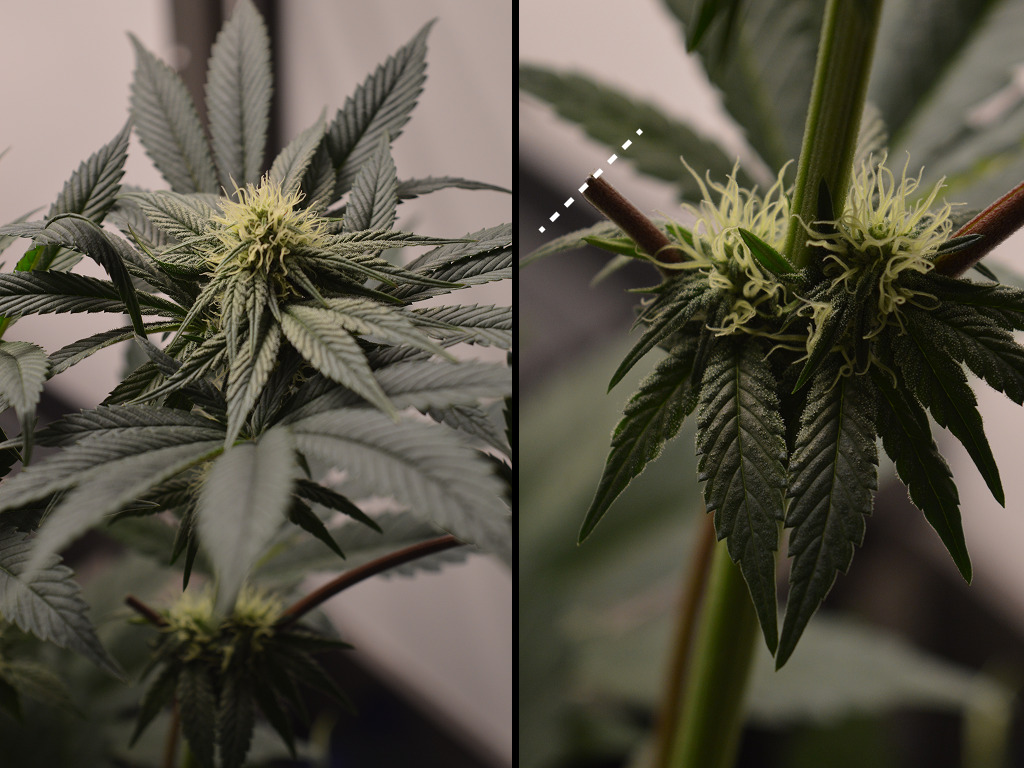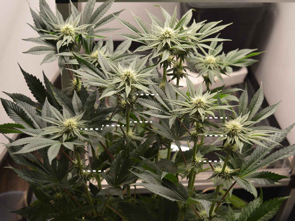 Op de tweede foto hierboven, heb ik aangegeven waar ik schutbladeren heb verwijderd. De plant wordt hierdoor wat meer open van structuur, en dit heeft drie grote voordelen. Ten eerste kan er nu meer lucht doorheen, waardoor de planten meer CO2 aangevoerd krijgen. Ten tweede zijn er minder bladeren die vocht verdampen, waardoor de luchtvochtigheid omlaag gaat, en het risico op toprot later, verkleint.