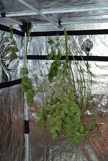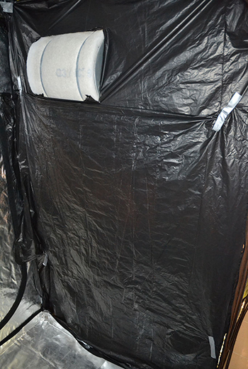 Aangezien ik eigenlijk geen plaats had om de Sticky Beast te drogen, heb ik de helft van de 240 tent ingericht als droogkamer. Heel eenvoudig, met enkele dikke zwarte vuilniszakken en plakband. Gewoon een gat in de vuilniszakken voor het koolstoffilter en klaar. In de andere helft staat de Runtz onder de 315 Watt CMH.
