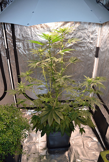 Begin april is de Runtz getopt en is ook de LST begonnen. Deze dame staat sinds 29/4 onder een 315W CMH lamp in de bloeitent in een grote 25-literpot. Sinds de overschakeling naar 12/12 is ze meer dan verdubbeld in hoogte, met twee grote uitlopers van het toppen.