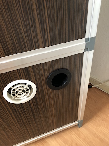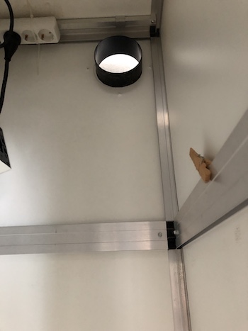 In de oude situatie ging de uitlaat via van een bocht in de isolatie slang door het plafond van de kast naar buiten. Door die bocht had ik veel weerstand in de luchtstroom waardoor het soms en vooral met warme dagen te warm kon worden in mijn kast.