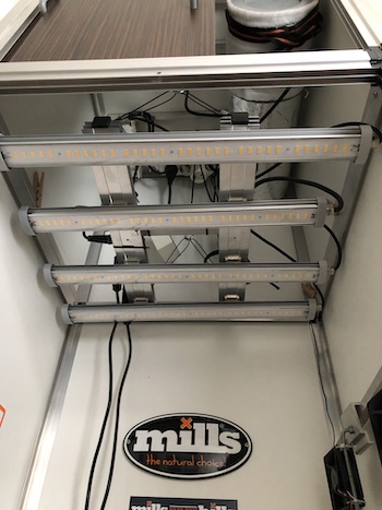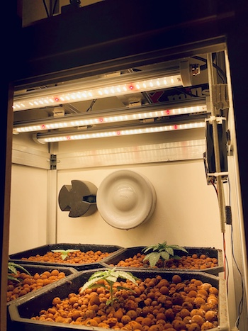 Inmiddels staan de vier plantjes negen dagen in de kast onder de led G-Bars. Ze groeien verbazingwekkend snel onder de bars. De ene dame die wat jonger is dan haar zusjes houdt het tempo ook nog aardig goed bij.