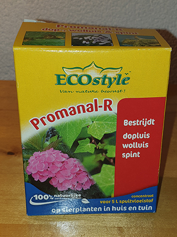 Het derde middel tegen de invasie was Ecostyle Promanal-R. Die kwam ik toevallig tegen in een tuincentrum. Dit spul leek even wat effect te hebben maar na 4 dagen was het probleem helaas weer net zo erg. Op dit moment zag de moederplant er niet meer uit. Ze was lichtgroen geworden en had bijna geen blad meer. Ik heb afscheid van haar moeten nemen.