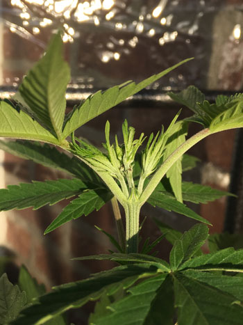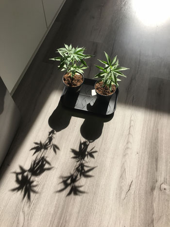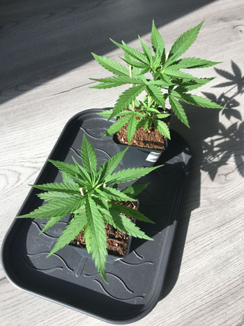 Met een zelf geknutselde doos, voorzien van een TL-lampje en timer moeten we deze dagen maar zien door te komen. De planten groeien niet heel snel maar reageren wel goed op het 18/6 lichtschema (18 uur licht, 6 uur donker). Met een goede opbouw van internodes en mooie groene bladeren als gevolg.