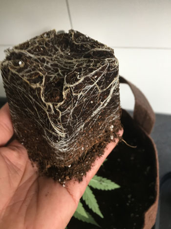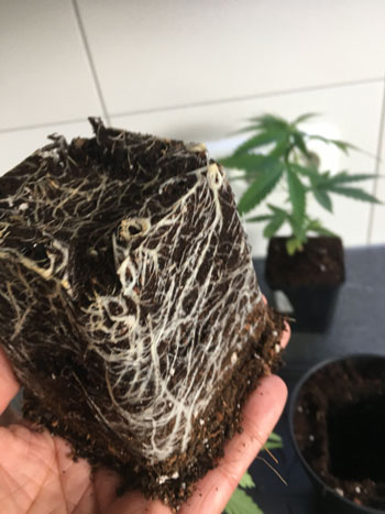 Het verpotten ging soepeltjes, de 10 x 10 potjes zijn volledig volgegroeid met mooie gezonde wortels. De BAC wortelstimulator heeft zijn werk weer prima gedaan. Ondanks dat ze ook week vijf en zes voornamelijk binnen hebben gestaan, gaat het groeiproces boven verwachting goed. Tijd om voor de eerste keer te toppen.