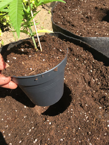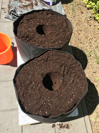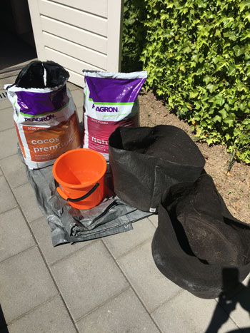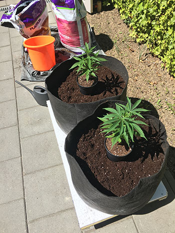 De zon schijnt en er is een paar dagen mooi weer voorspeld dus nu moet het gebeuren. Het zorgvuldig vullen van de potten en het overzetten van de plantjes voelt elk jaar weer als een feestdag! De Smartpots vul ik met Plagron Lightmix. Om het geheel luchtig te houden voor een betere wortelgroei voeg ik één derde deel Plagron Cocos toe.