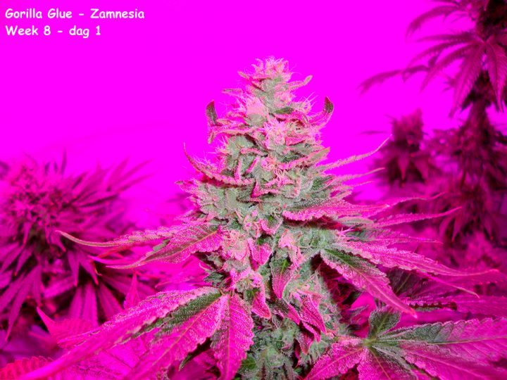 Acht weken bloei zit er inmiddels op voor de Gorilla Glue van Zamnesia. De meeste toppen zijn nagenoeg rijp en plakken als de neten, Gorilla Glue doet haar naam eer aan. De planten worden op dit moment gespoeld met water zonder voeding of andere toevoegingen en de oogst zal niet lang meer op haar laten wachten. Spoelen wordt vooral gedaan om opgestapelde zouten uit de aarde weg te spoelen. De planten krijgen zo een week of twee de tijd om schoon water te drinken en een smakelijker eindproduct af te leveren.