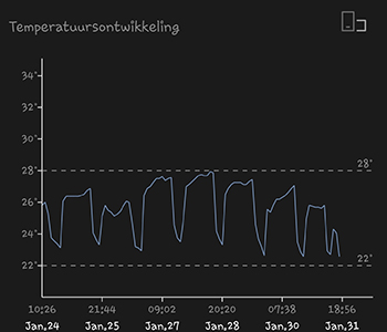 De gemiddelde temperatuur van afgelopen week was 24,89 graden Celsius. De gemiddelde luchtvochtigheid van afgelopen week was 39,11 procent. Deze zie je in de grafiek op 26 januari omhoog schieten tot 30 januari wanneer de luchtvochtigheid weer dalende is. Dit kwam door het plaatsen van een schaal gevuld met water, die ik vergeten was aan te vullen. Het is dan wel weer mooi dat je dit dan meteen weer terug ziet in grafiek.