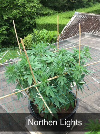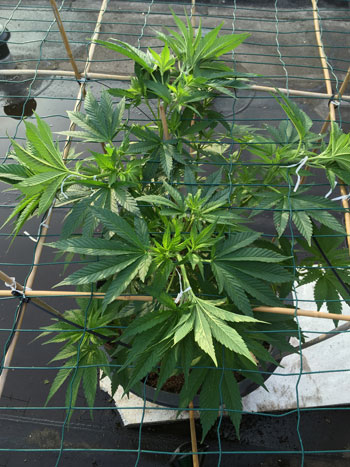 De planten zijn al heel vol en bossig en hebben lange internodes. Ik doe er eigenlijk weinig aan, de natuur doet het meeste werk. De dames die in een scrog staan (AK-47 en Northern Light) buig ik af en toe even, waarna ik ze aan het gaas bind. De dag erna staan er alweer nieuwe potentiële toppen omhoog. Ik ben heel benieuwd wat deze planten gaan doen zodra de bloei erin zit.