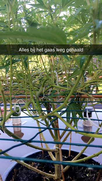 Schrik niet, ik bedoel geen wietdieven, maar wel de handeling dieven. Een paar keer per week krijgen de planten een grondige snoeibeurt. Alle kleine topjes die dicht bij het gaas groeien (en weinig licht opvangen) haal ik weg. Ik ga alleen voor de grotere toppen, en hou op deze manier ook genoeg ruimte over voor lucht circulatie. Door de planten wat uit te dunnen kan de wind er goed doorheen blazen, en blijft vocht niet hangen. Dit verkleint de kans op toprot, iets om rekening mee te houden in de nazomer.