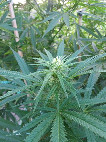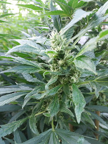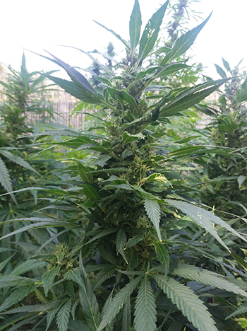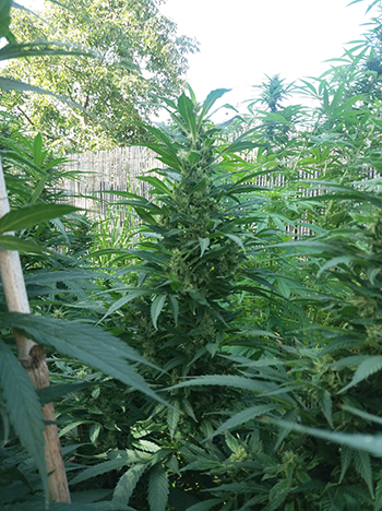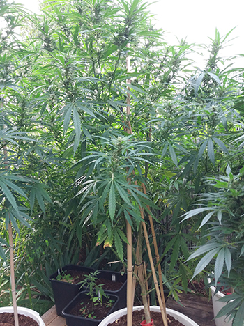 Uit een van de kleine OG-zaadjes is een gespierd mannetje gegroeid. Nu hoor ik je denken, gespierd? Als je de stam zou doorknippen en de doorsnede zou bekijken, is deze bloemvormig in plaats van rond. Als dit zo is, kan ik er meestal vanuit gaan dat dit een krachtige plant is, met een holle stam. Wrijf ik de stam tussen duim en wijsvinger, dan kan ik al een beetje het terpenenprofiel ruiken. Dat zit bij dit mannetje wel goed. Daarom heb ik de twee planten samen achterin de tuin gezet. Ze kunnen zich daar in alle privacy gaan vermenigvuldigen.