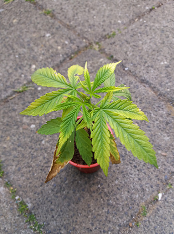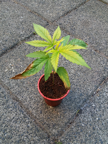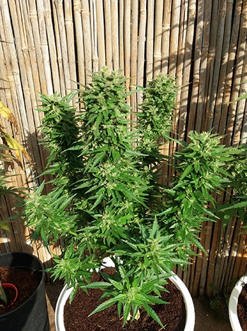 Ik hergebruik de kokos altijd een paar kweekrondes. Als ik gebruikte kokos voor kleine plantjes kies, dan ben ik altijd wat voorzichtig met het geven van voeding. Het liefste spoel ik in de laatste fase zo lang mogelijk met water. In de 65 liter speciekuip, met fotoperiode-gevoelige planten wel vier weken lang. Bij de autoflowers in de 18-literpotten, hou ik het op twee weken. Dit is soms moeilijk te bepalen omdat de omstandigheden niet altijd optimaal zijn en je soms wat eerder moet oogsten dan wat wenselijk is. Hierdoor had ‘schoonmoeders’ Kush (zie mijn vorige verslag) wat tekort aan voeding gekregen. Na wat extra aandacht, zorg en een nieuw potje heeft ze weer kleur gekregen.