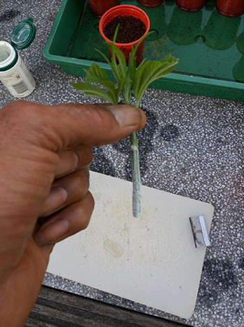 De Arjan’s Haze, de Black Domina Kush en de Bjorns groeien ook goed. Inmiddels heb ik de planten getopt. Ik heb de bovenste scheut eruit gesneden, er een stek van gemaakt en die gelabeld. De verse stekjes houden niet van de volle zon. Was ik even de tijd vergeten, hebben ze een uurtje in de zon gestaan, helemaal slap. Eens kijken wat het word, anders maken we nieuwe.