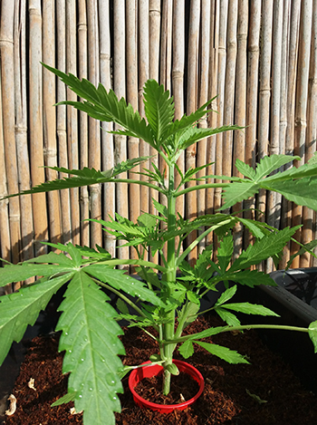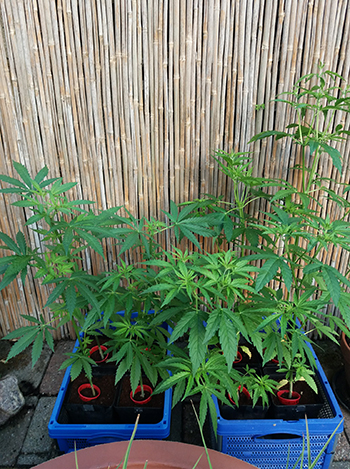 De OG’s uit de tweede ronde gaan ook lekker in hun 18-literpotten. Ze krijgen 40 milliliter Canna Coco A&B op 10 liter water. Vanwege de droogte van de afgelopen tijd was mijn regenwatervoorraad opgeraakt, dus heb ik de voeding met kraanwater aangemaakt. Maar zoals ik zei, ze gaan er goed op. Sommigen vertonen al kleine topjes. Op één na zijn het allemaal vrouwelijke planten. De mannelijke plant heb ik gefotografeerd en naar de Gouden Gieter opgestuurd.