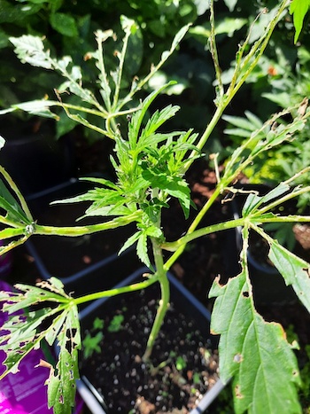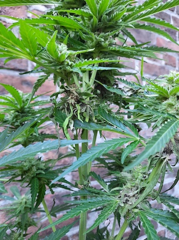 Door alle regen en de hoge luchtvochtigheid ontstonden de volgende tegenslagen voor de autoflowers. De bekende botrytis, ofwel toprot, kwam als eerste. Ik had het gelukkig vroeg in de gaten. Maar wat begint als een klein vlekje, is morgen een rotte top. Dus ook nu weer snel handelen. Alle rot eruit knippen en zo snel mogelijk oogsten. Er zit niets anders op. De Auto Camelberry heb ik hierdoor ook te vroeg moeten oogsten. Ik heb de takken en de grote schutbladeren verwijderd en de bloemtoppen zonder te drogen ingevroren om later Ice-o-lator hasj te maken. Na de toprot uitbraak volgde een explosie van meeldauw. De ene na de andere autoflower moest het begeven.